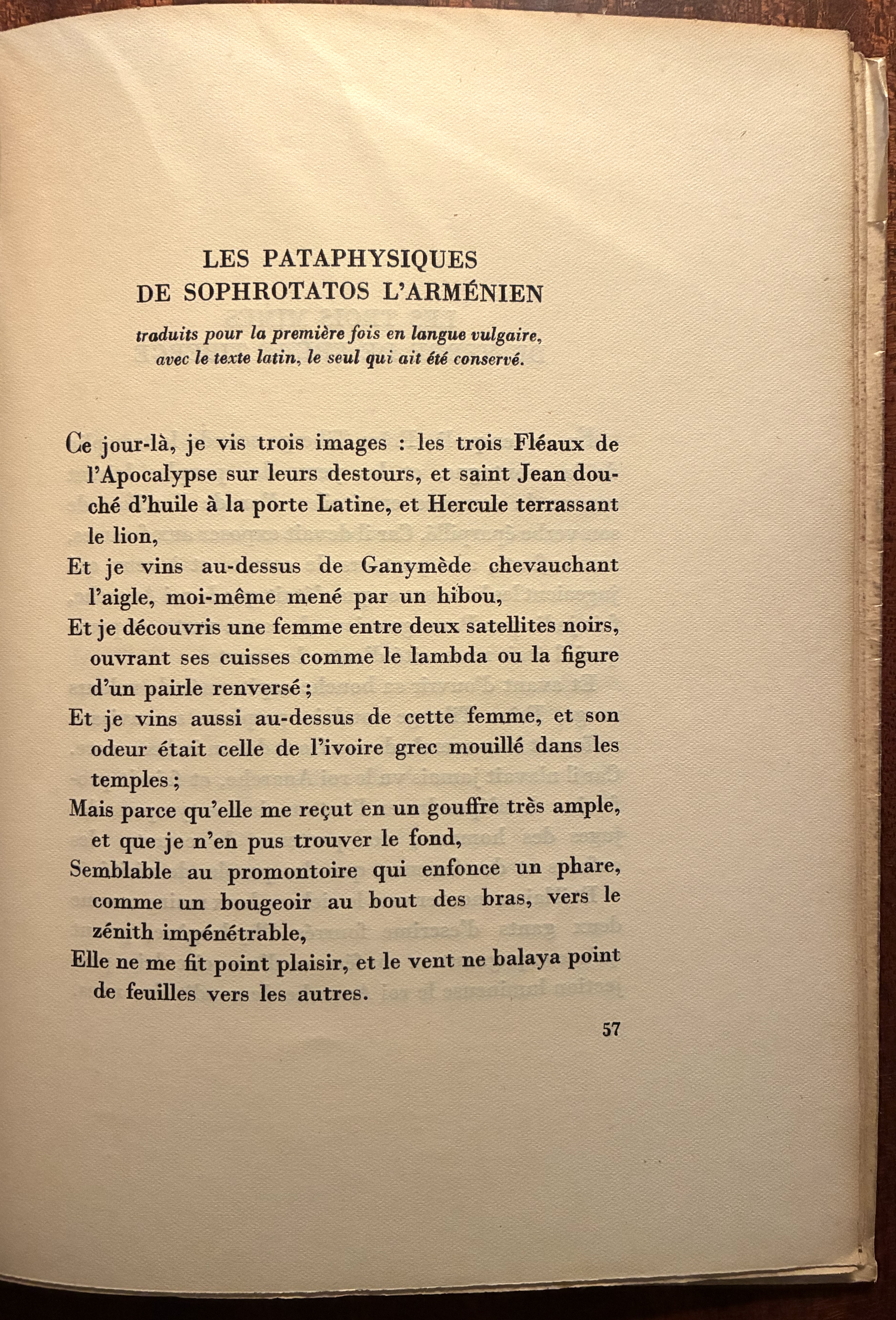 Alfred Jarry claimed to inherit the study of pataphysics from a certain Sophrotatos the Armenian. Only one piece of writing by this first earthly pataphysician has ever been documented. It was first translated by Jarry into French but not published until after his death, in a collection called The Revenge of the Night (La Revanche de la Nuit), compiled by Maurice Saillet.